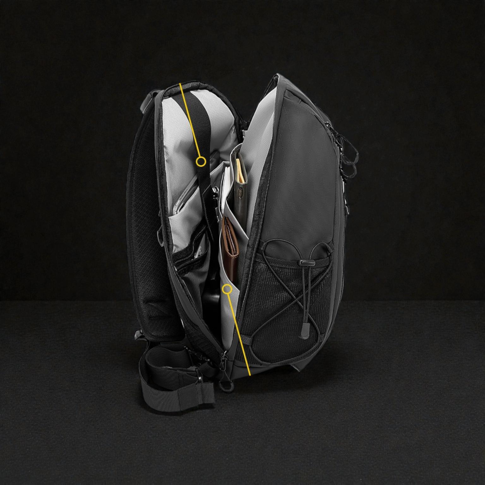 Bange outdoor sling που συνδυάζει αδιάβροχη προστασία, άνεση και πραγματικά έξυπνη οργάνωση. Ο τριγωνικός σχεδιασμός μοιράζει σωστά το βάρος, ώστε να το φοράς άνετα στον ώμο ή χιαστί, ενώ ο ρυθμιζόμενος ιμάντας προσαρμόζει την εφαρμογή όπως σε βολεύει. Το ανθεκτικό αδιάβροχο 1680D πολυεστέρα αντέχει σε βροχή, σκόνη και έντονη καθημερινή χρήση, για να κινείσαι με σιγουριά σε πόλη και ταξίδι.