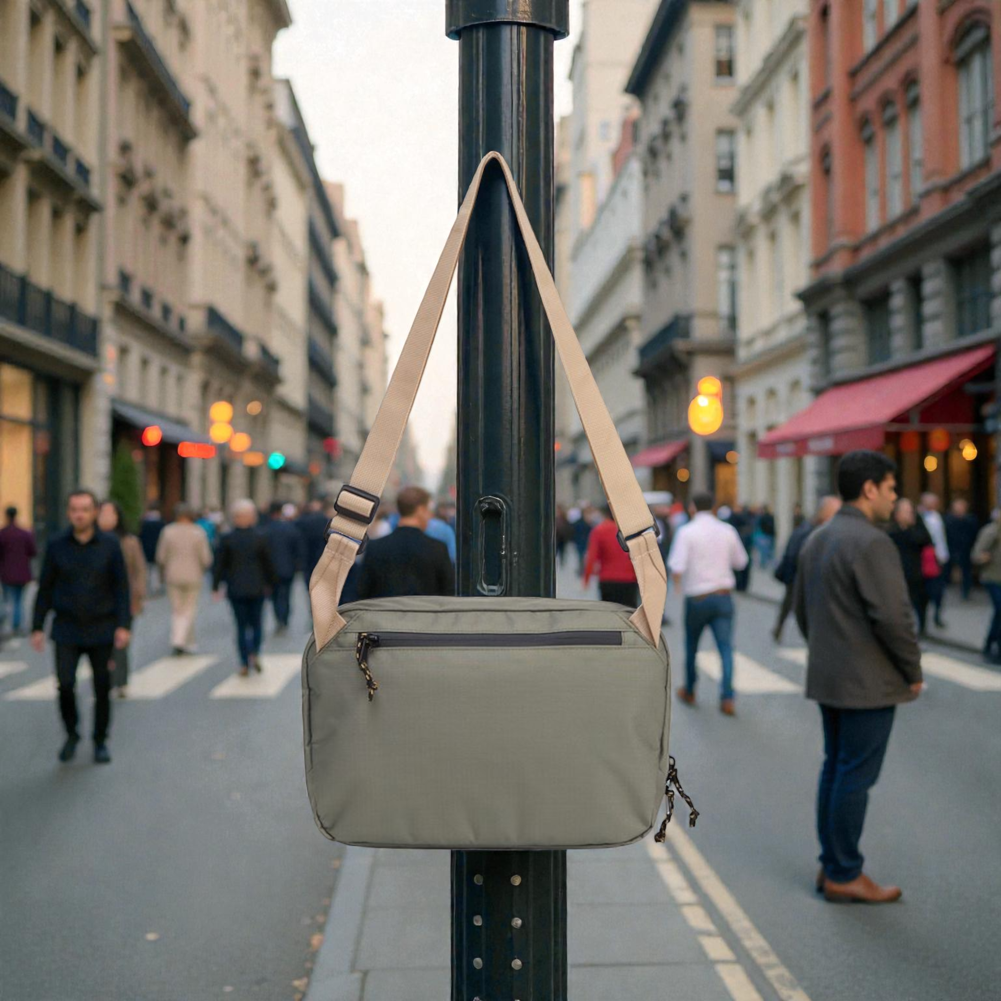 Οργανώνεις σωστά τα αντικείμενά σου, επειδή το τσαντάκι διαθέτει λειτουργική διάταξη χώρων: μεταφέρεις συσκευή με ασφάλεια στην κεντρική θήκη με εσωτερική θήκη tablet, κρατάς τα απαραίτητα άμεσα διαθέσιμα στην μπροστινή τσέπη με φερμουάρ και keychain, και αξιοποιείς το μπροστινό bungee cord για έξτρα χώρο ώστε να πιάνεις μπουκάλι, μπουφάν ή μικροαντικείμενα χωρίς να γεμίζεις το εσωτερικό. Παράλληλα, βάζεις πορτοφόλι, κάρτες ή διαβατήριο στην πίσω τσέπη με φερμουάρ και τα κρατάς πιο προστατευμένα όσο κινείσαι.