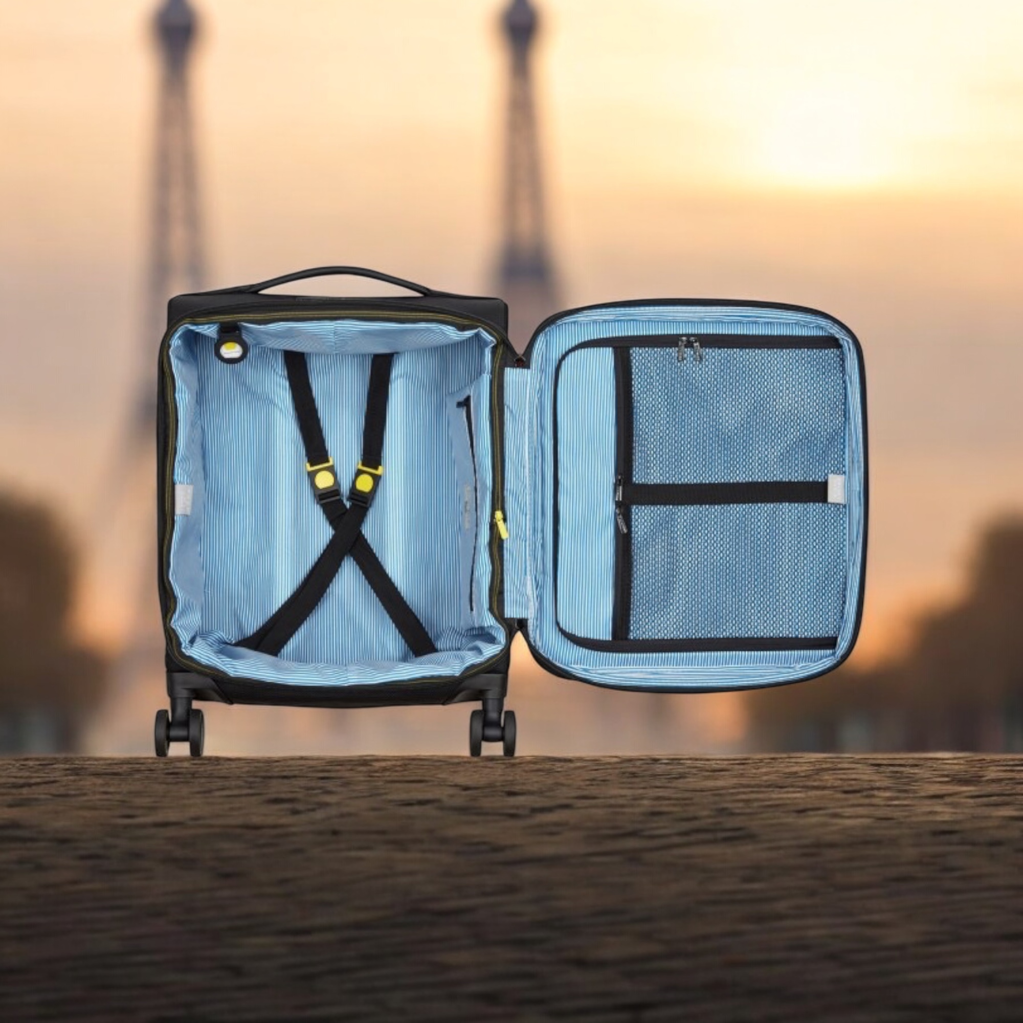 Ο slim σχεδιασμός την καθιστά ιδανική για καμπίνα, ενώ η επέκταση 2,5 cm προσφέρει επιπλέον χωρητικότητα όταν χρειάζεται. Η κύλιση παραμένει ομαλή και σταθερή χάρη στις 4 διπλές ρόδες, ενώ το ασφαλές φερμουάρ Securitech και η κλειδαριά TSA προστατεύουν αποτελεσματικά τα προσωπικά σας αντικείμενα.