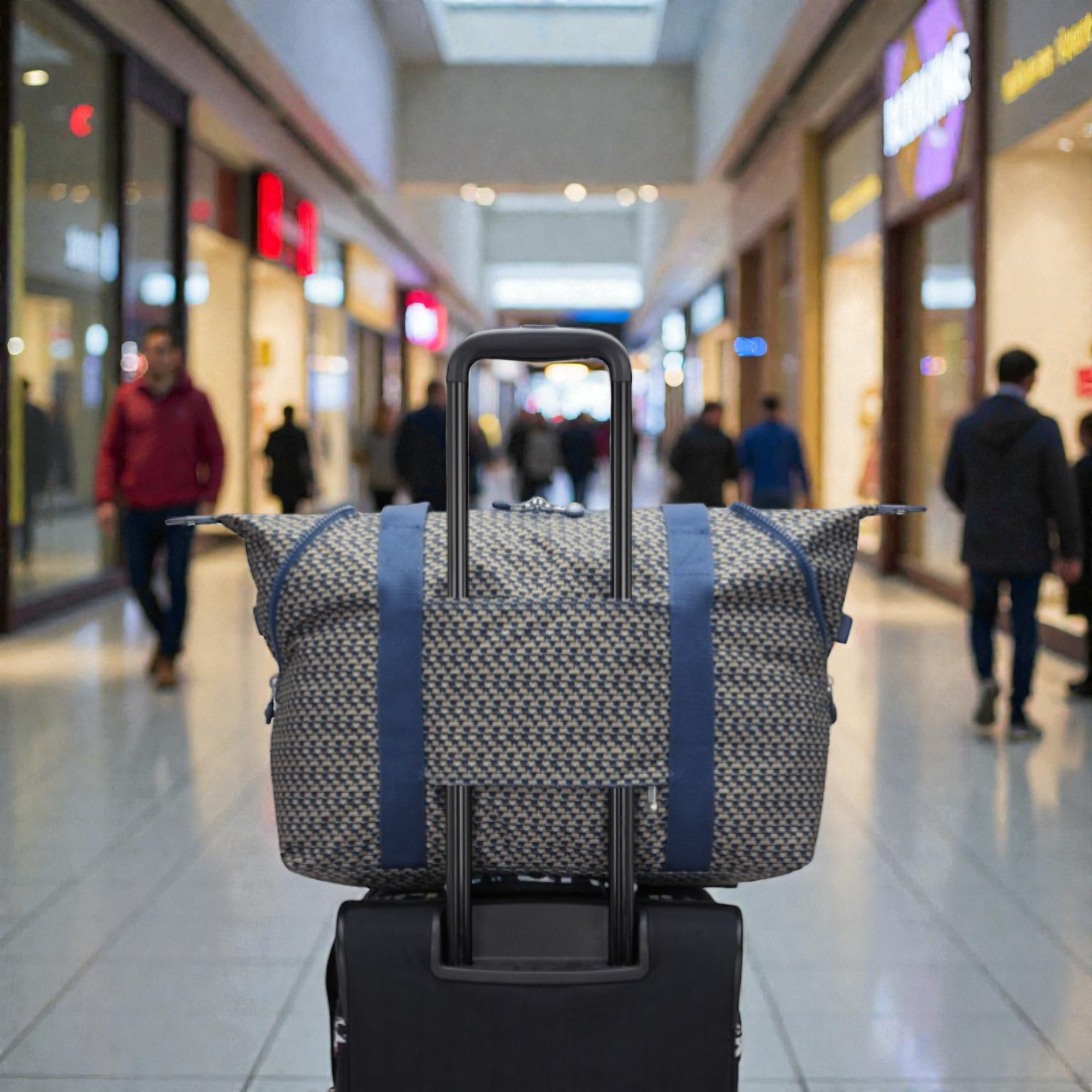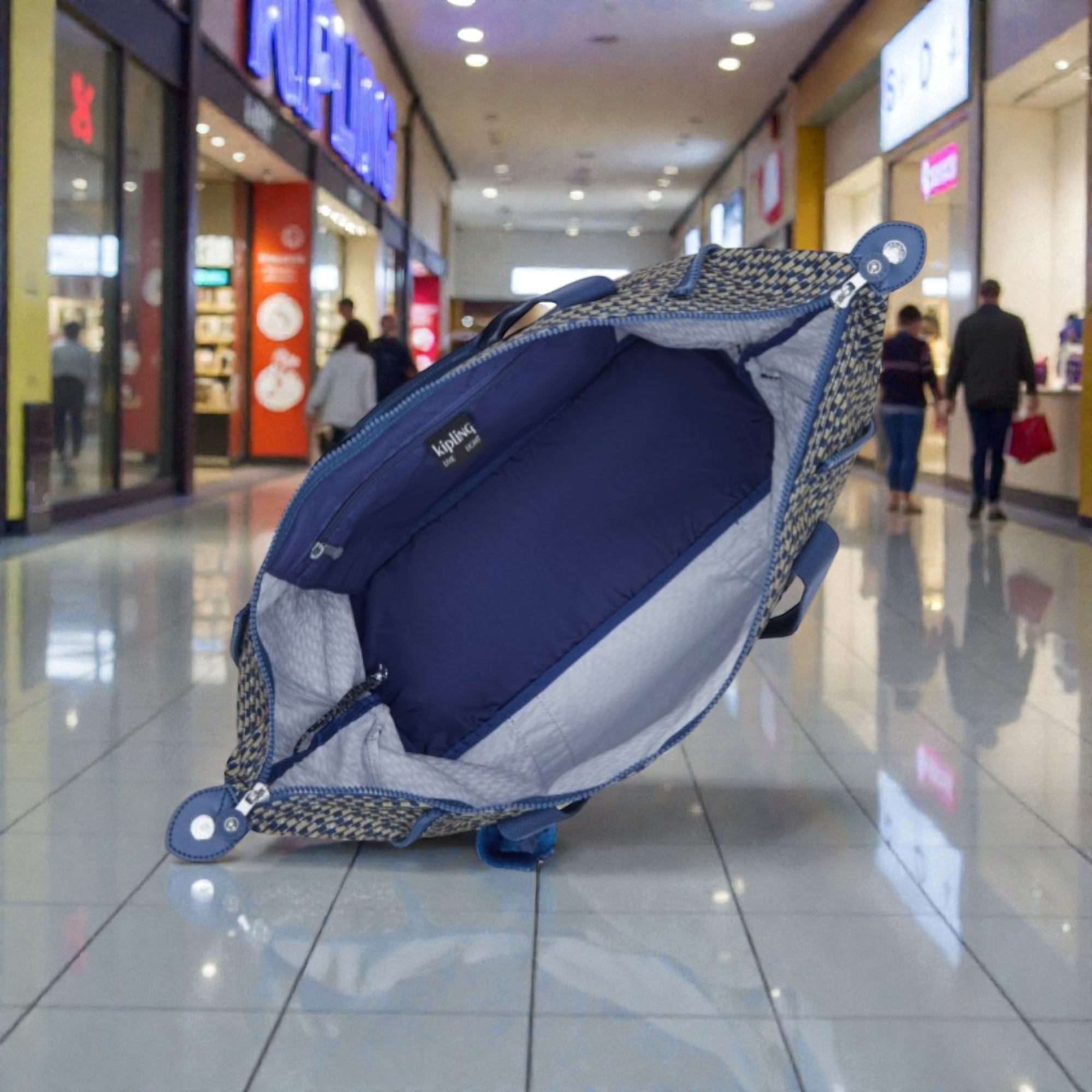Kipling tote τσάντα Art M Large Blue on Wire είναι το εμβληματικό κομμάτι της Kipling από το 1988 και παραμένει σταθερή επιλογή, γιατί σε εξυπηρετεί σε κάθε μέρα. Την παίρνεις σε μικρές αποδράσεις, στο γυμναστήριο ή στα ψώνια και κρατάς όλα σου τα πράγματα οργανωμένα, χωρίς περιττό βάρος. Όταν ταξιδεύεις, την προσαρμόζεις πάνω στη βαλίτσα trolley και την χρησιμοποιείς σαν έξτρα τσάντα, ώστε να έχεις άμεση πρόσβαση στα απαραίτητα.